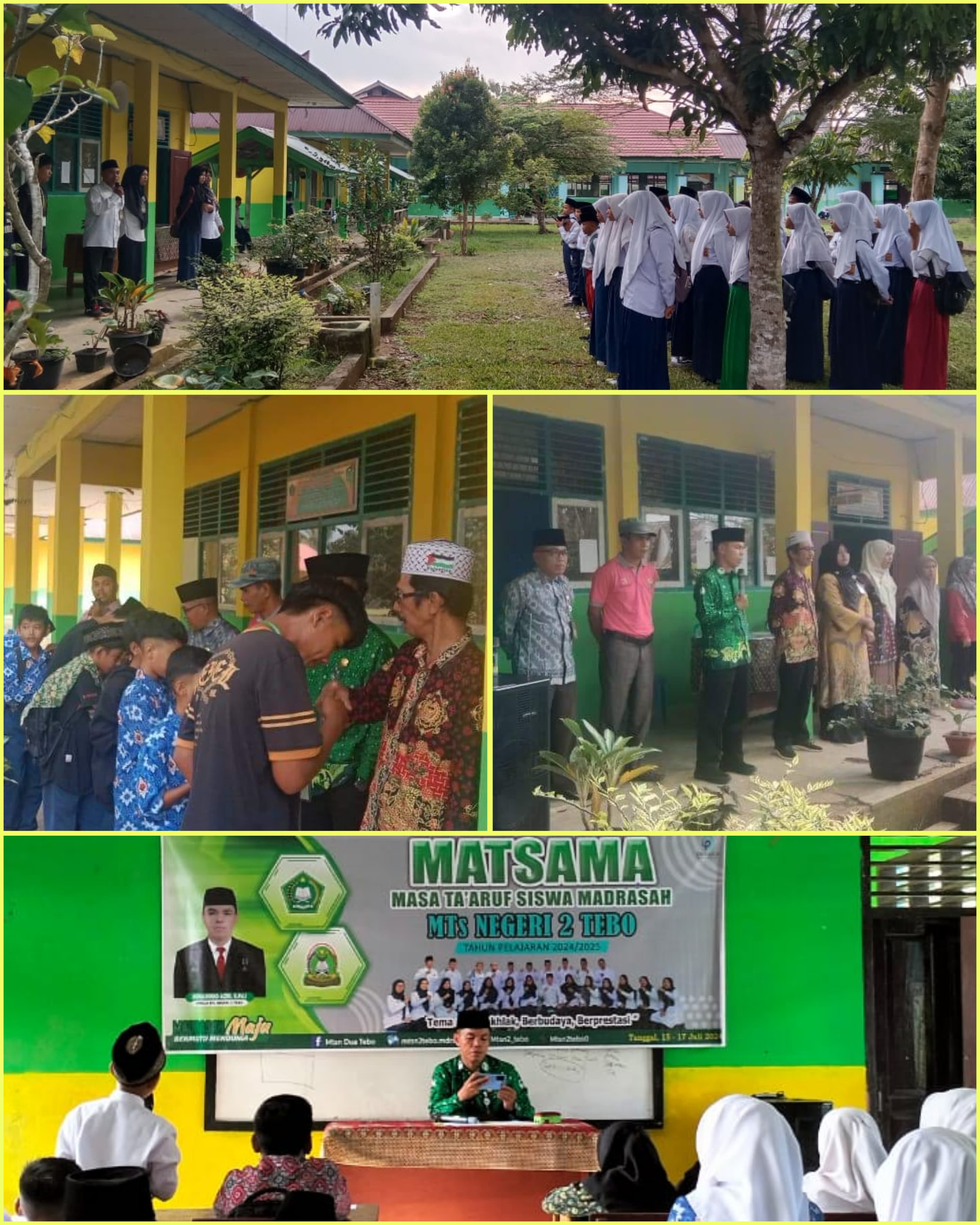 Senin, 15 Juli 2024 MTs Negeri 2 Tebo melaksanakan hari pertama MATSAMA. Kegiatan ini berlangsung selama tiga hari yaitu mulai senin 15 Juli 2024 sampai Rabu 17 Juli 2024. Masa Ta'aruf Siswa Madrasah (MATSAMA) adalah periode khusus di awal tahun akademik di madrasah yang bertujuan untuk memperkenalkan siswa baru kepada lingkungan madrasah serta komunitasnya. Selama MATSAMA, kegiatan orientasi diadakan untuk membantu siswa baru memahami aturan, rutinitas, dan harapan akademik madrasah. Selain itu, MATSAMA juga mencakup kegiatan sosial, budaya, dan keagamaan yang bertujuan untuk mempererat hubungan antara siswa, guru, dan tenaga kependidikan madrasah. Tujuan utamanya adalah untuk membantu siswa baru beradaptasi dengan lingkungan barunya dan merasa nyaman dalam komunitas madrasah.