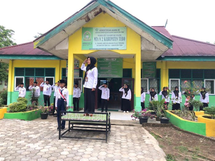 Tebo Ulu, 3 November 2025 — Madrasah Tsanawiyah Negeri 2 Tebo melaksanakan kegiatan rutin upacara bendera di halaman madrasah. Kegiatan yang diikuti oleh seluruh guru, tenaga kependidikan, dan peserta didik ini berlangsung dengan khidmat, tertib, dan penuh semangat kebangsaan.