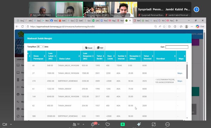 Kegiatan ini bertujuan untuk meningkatkan akurasi dan kelengkapan data sarana dan prasarana madrasah sebagai dasar perencanaan, pengembangan, serta pengambilan kebijakan di lingkungan Kantor Wilayah Kementerian Agama Provinsi Jambi. Zoom meeting tersebut diikuti oleh para kepala madrasah dan operator sarana prasarana dari berbagai madrasah di Provinsi Jambi.